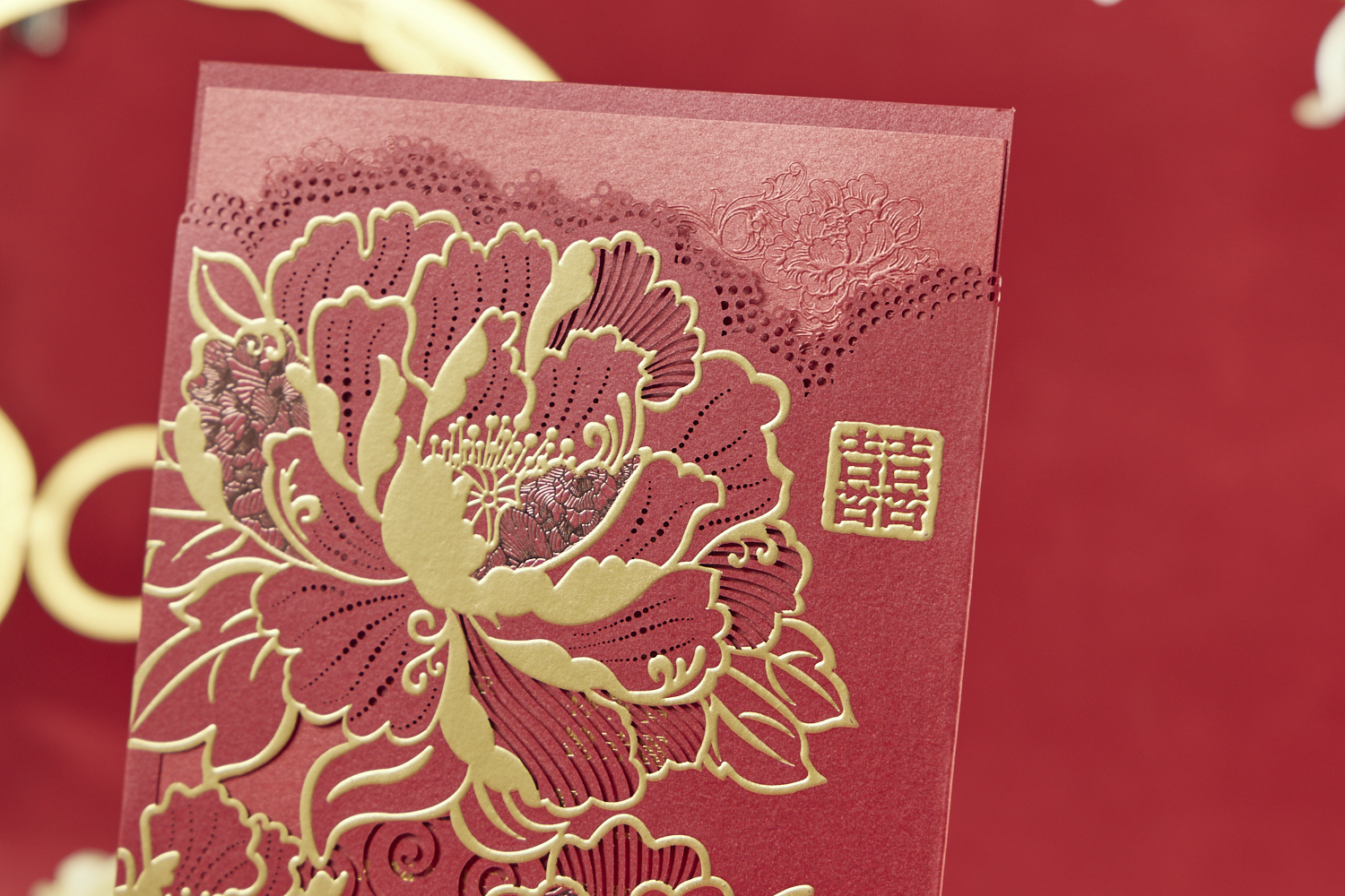 將牡丹圖騰放大近滿版,燙金與雷雕線條呈現花瓣立體面及紋路,就是要顯得光彩奪目!