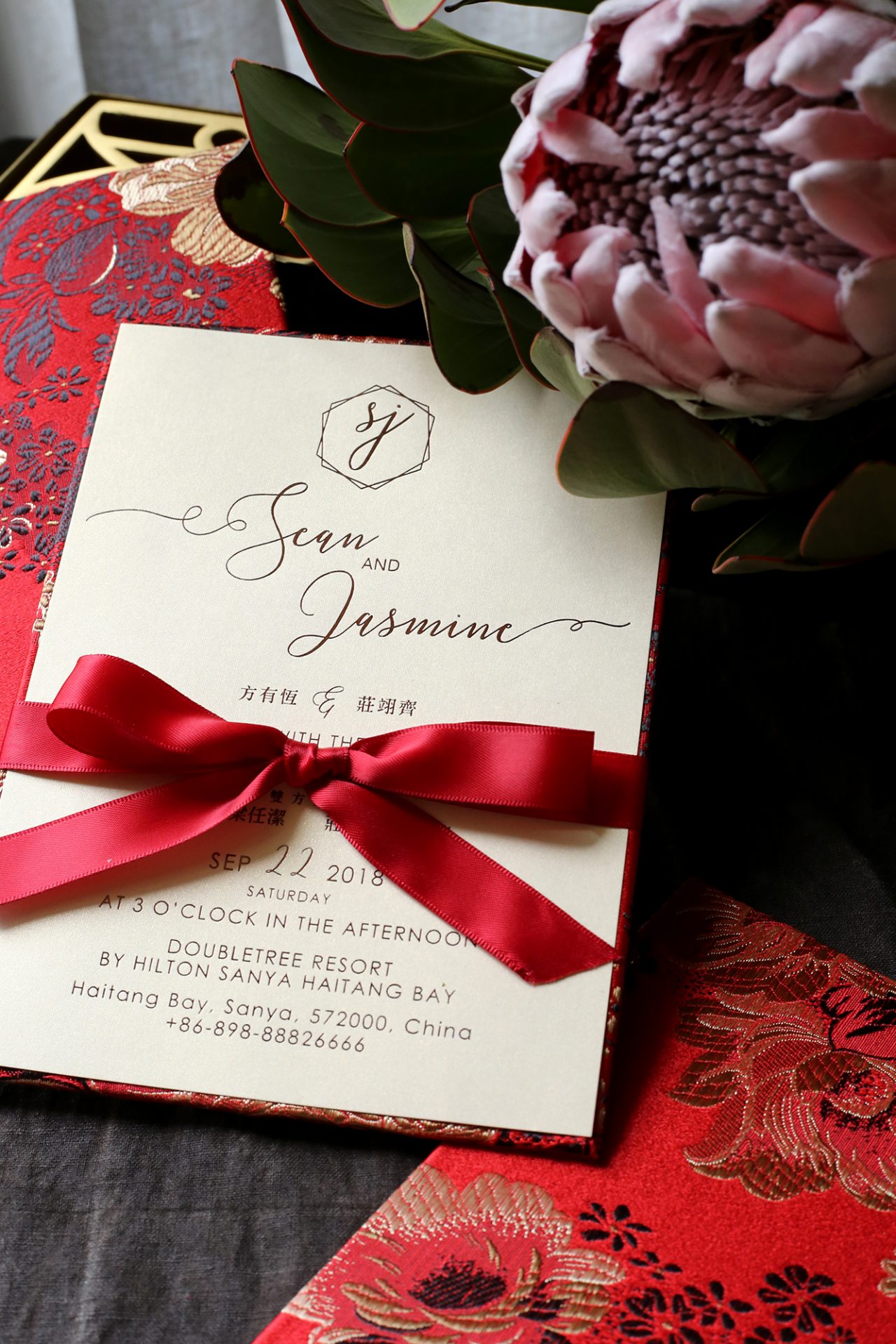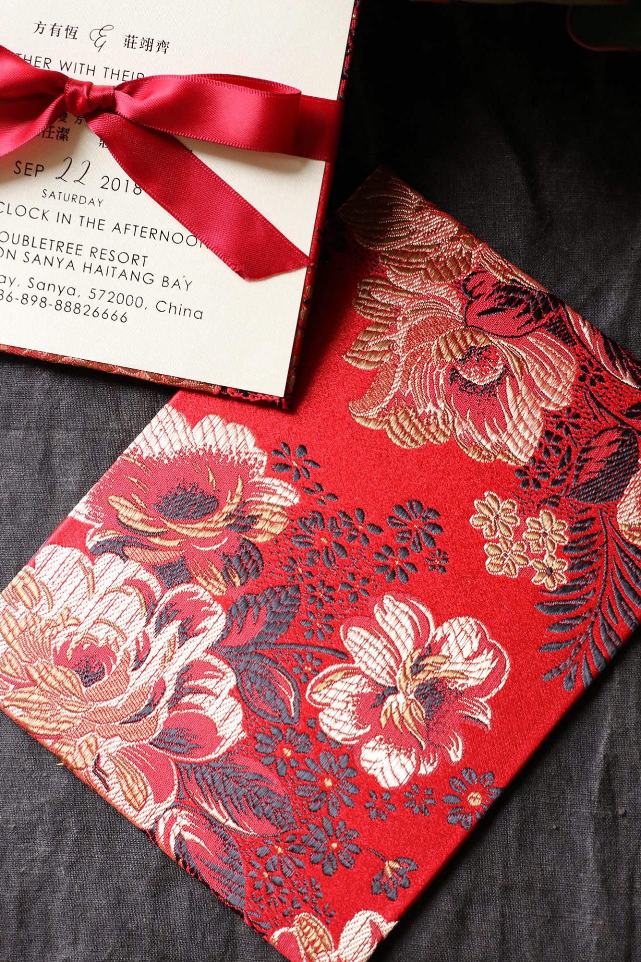 奶油喜帖精心挑選了錦花緞布,裱成精裝單張的厚卡,比常規尺寸放大了一些,更顯得大器無比,緞帶為選配。
