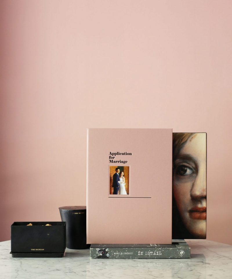 書約夾外殼正面打凹方框,可以將你們的照片切割貼上(尺寸為:51*76 mm),或是貼上我們提供的小卡片(一份含有灰/白兩款),成為屬於你們的經典收藏。以霧灰櫻色紙裱裝成精裝書的硬殼質感,封面燙上碳黑色霧箔字樣「APPLICATION FOR MARRIAGE」 。