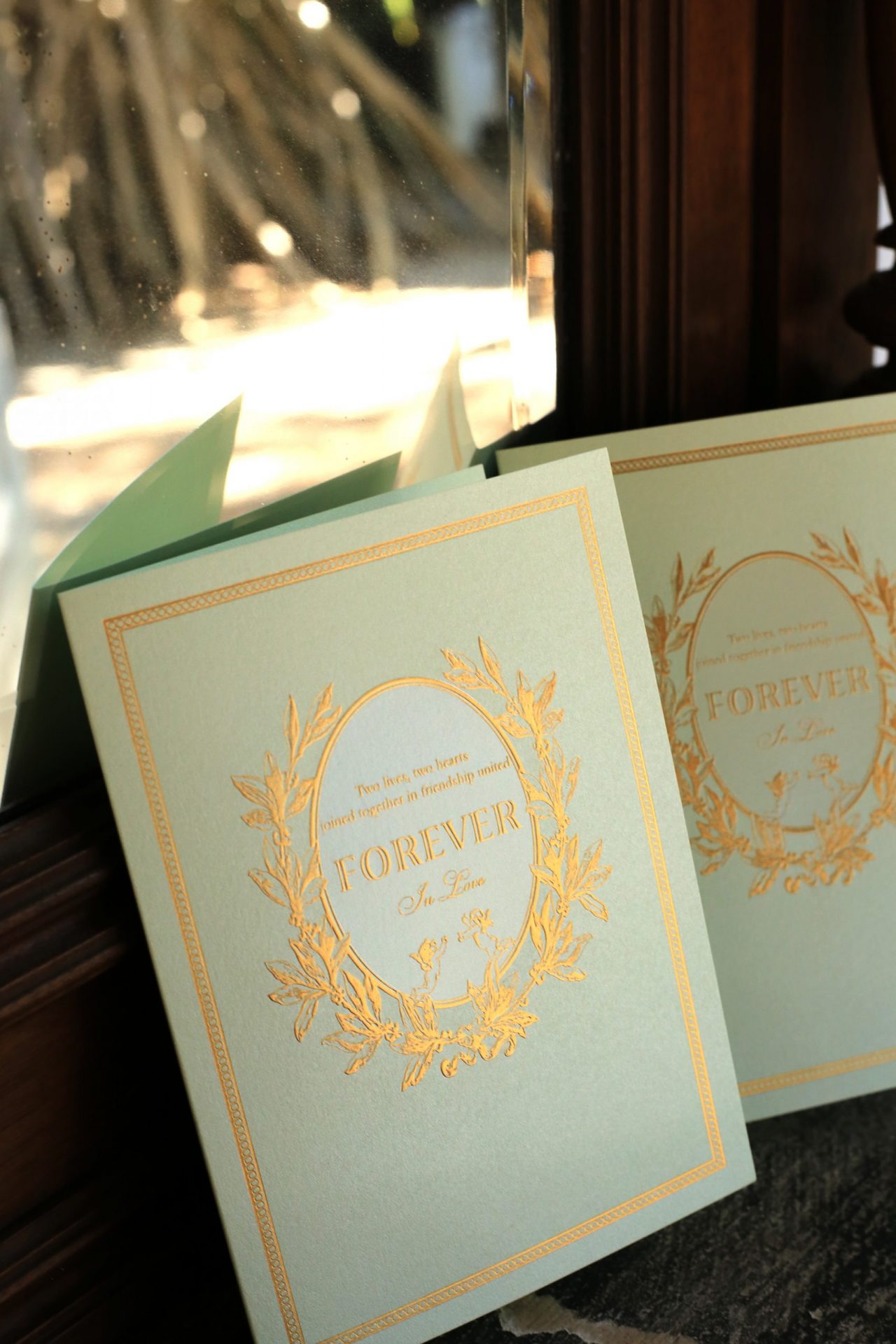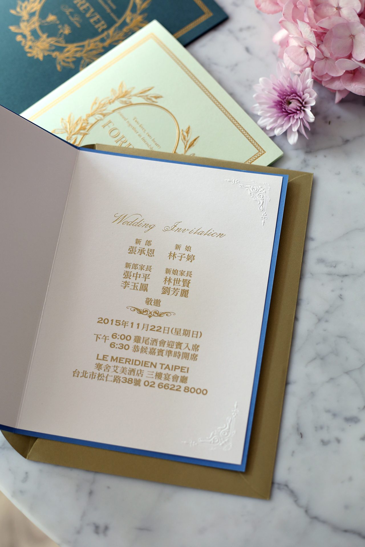 三款式皆搭配香檳金信封,內文燙金呈現。