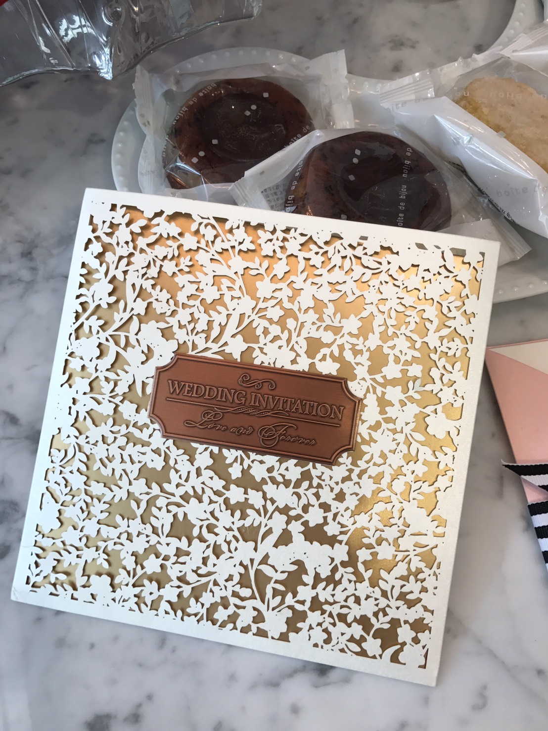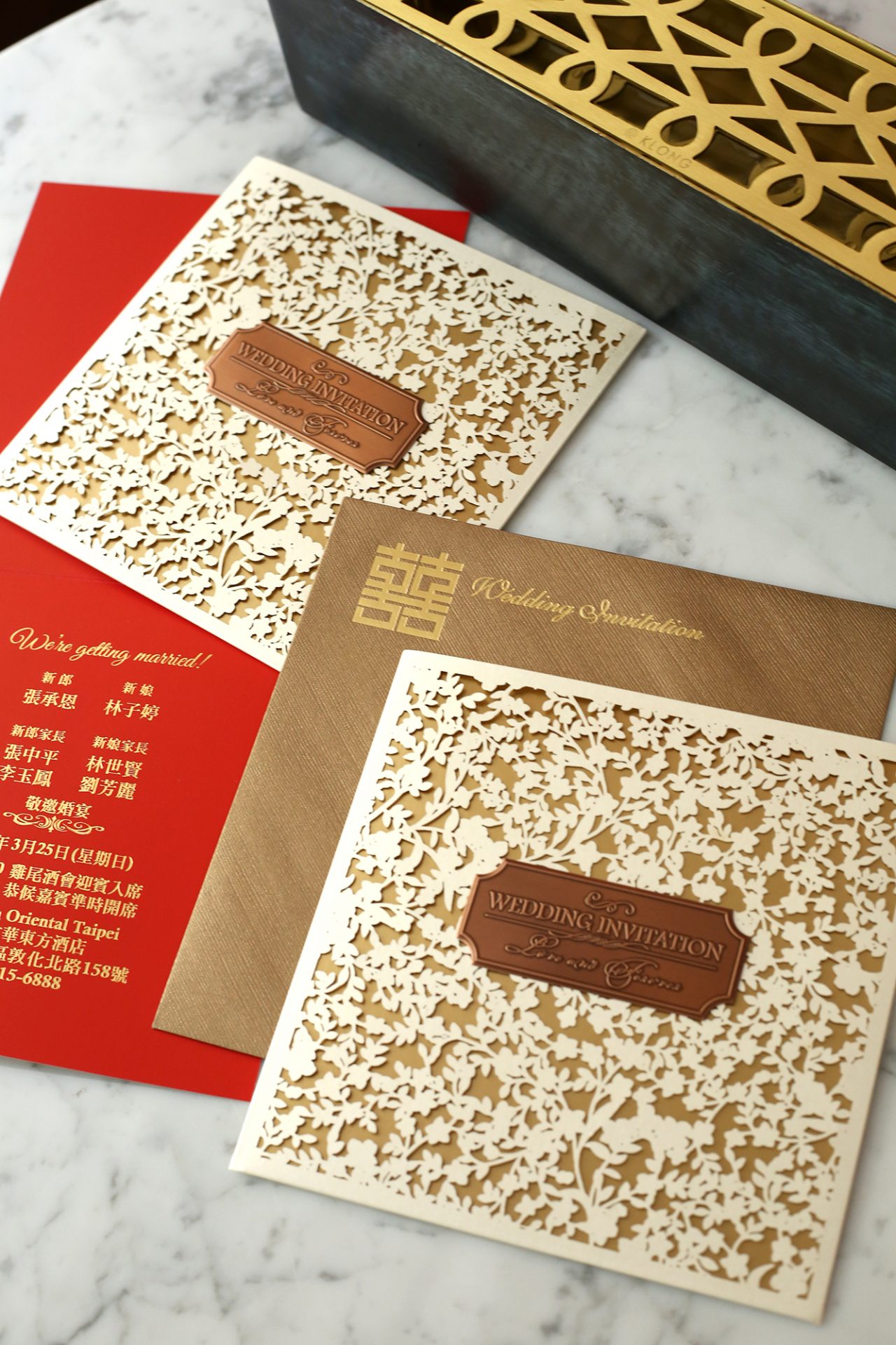 喜帖的雕花精細、質感非一般的傳統喜帖可比擬,拿給老公及家人看的時候,大家都會發出驚嘆聲,因為真的是太美啦!!!