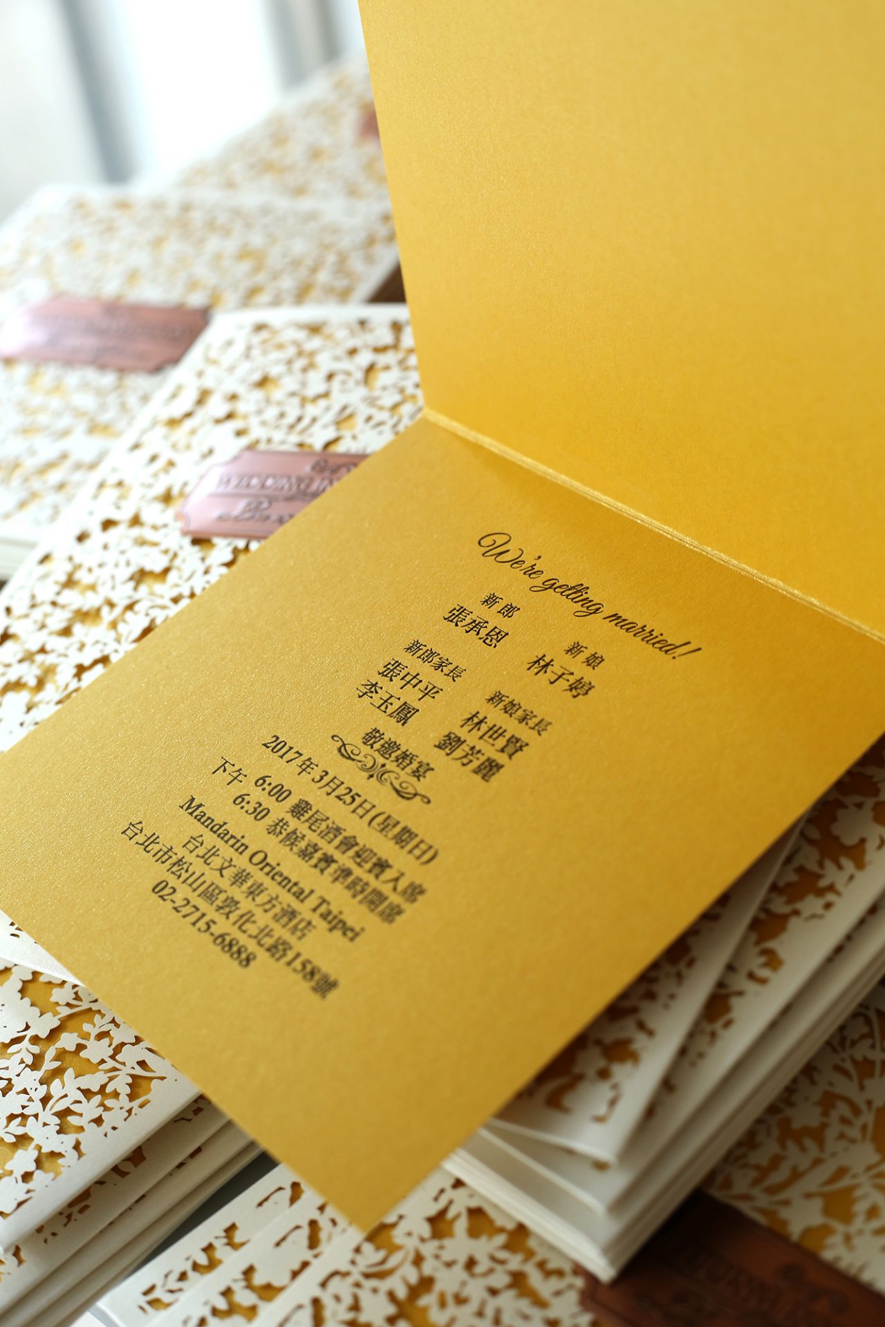 當我收到屬於我倆印製完成的喜帖時,感受到紙質質感相當的好,內文也是精美的燙金,有一種隆重的感覺,可以想見收到的賓客心中的感受也必定是相當喜悅。