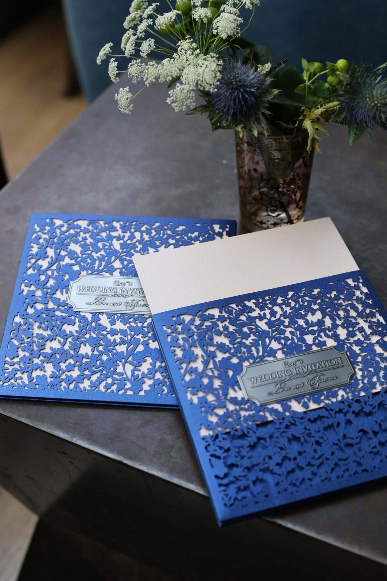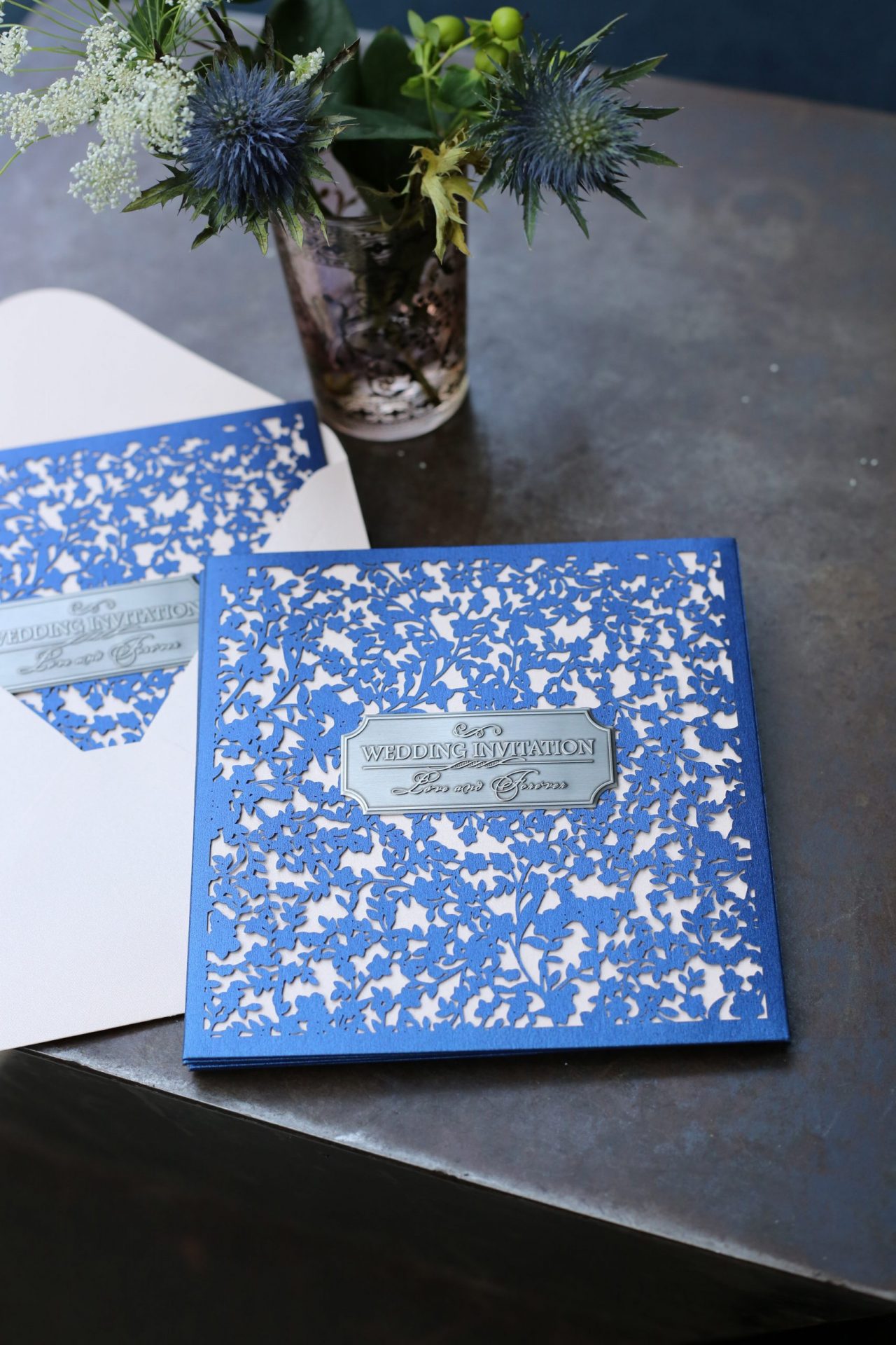 奶油喜帖打造專屬金屬立體貼標,鑲嵌在厚磅普魯士藍紙上,