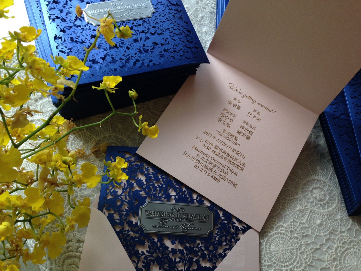 我們用上非常漂亮的寶藍色紙張,配合銀色的金屬銘版,這樣的不走傳統紅色的氣質喜帖,剛好可以代表你的品味卓越,眼光就是和他人不一樣。
