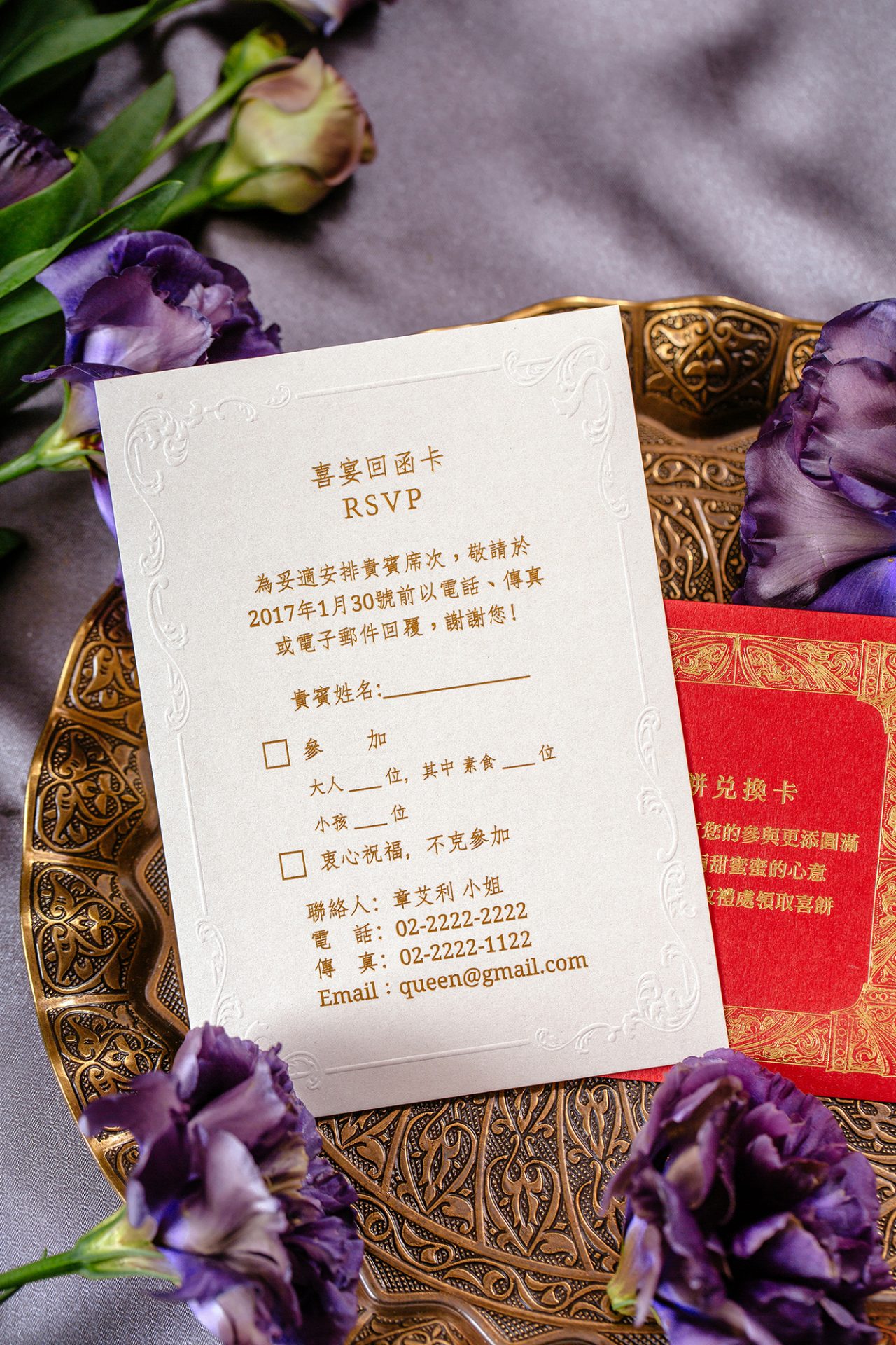 RSVP 來自於法文縮寫 ” Répondez, S’il Vous Plaît “,意思是 ” 請回覆 “,英文為 ” respond if you please “,中文為 ” 喜宴回函卡”,所以不是喜帖喔!RSVP的大小大概只有一般喜帖的一半,尺寸大約為105 x 150 mm。