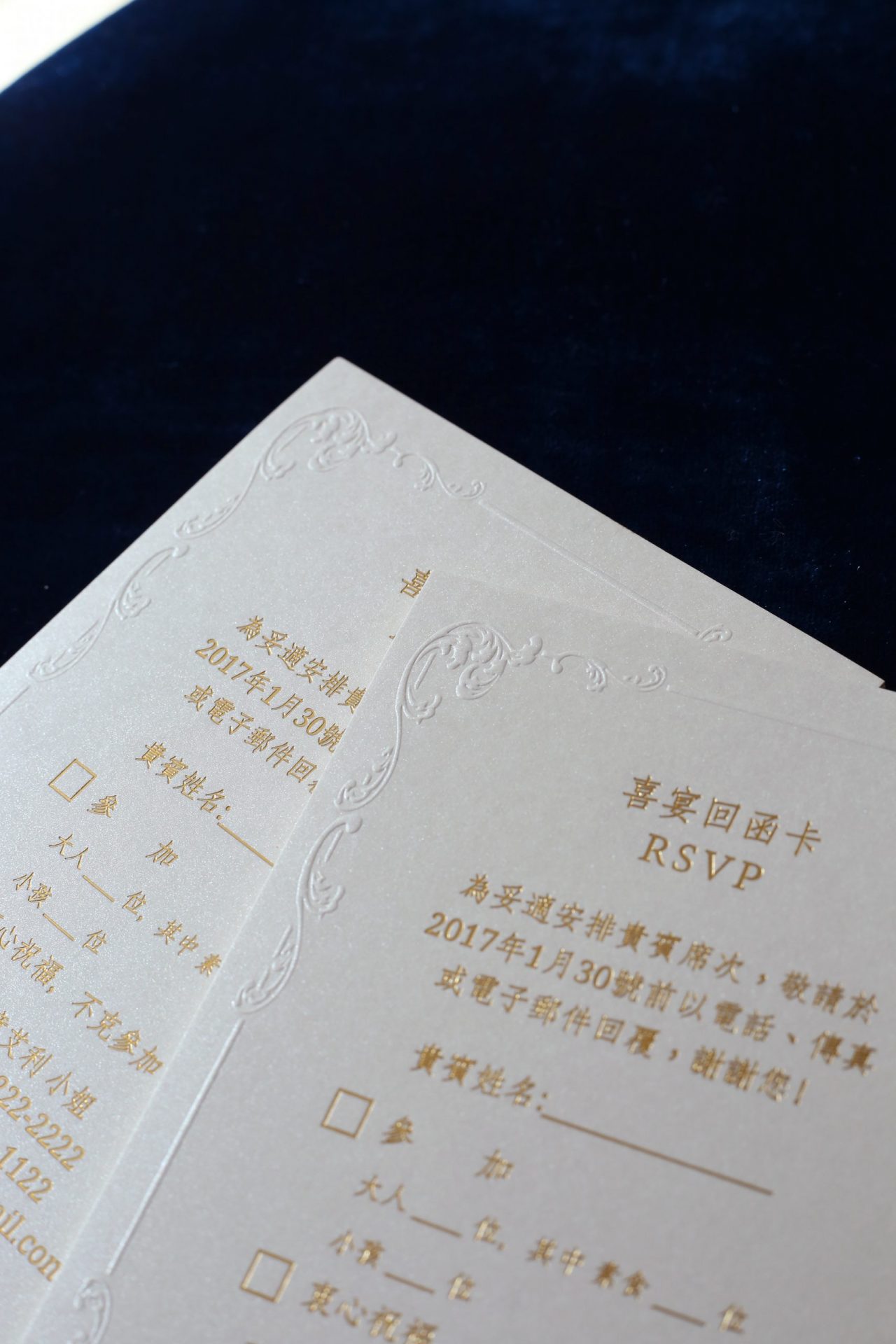 奶油的RSVP 會以淺色紙張燙金印製,以便於賓客若需要以傳真回傳的顯影,尺寸大約為105 x 150 mm。下單後請於備註欄註明RSVP的連絡人資訊,或是您也可以客製您的wording。