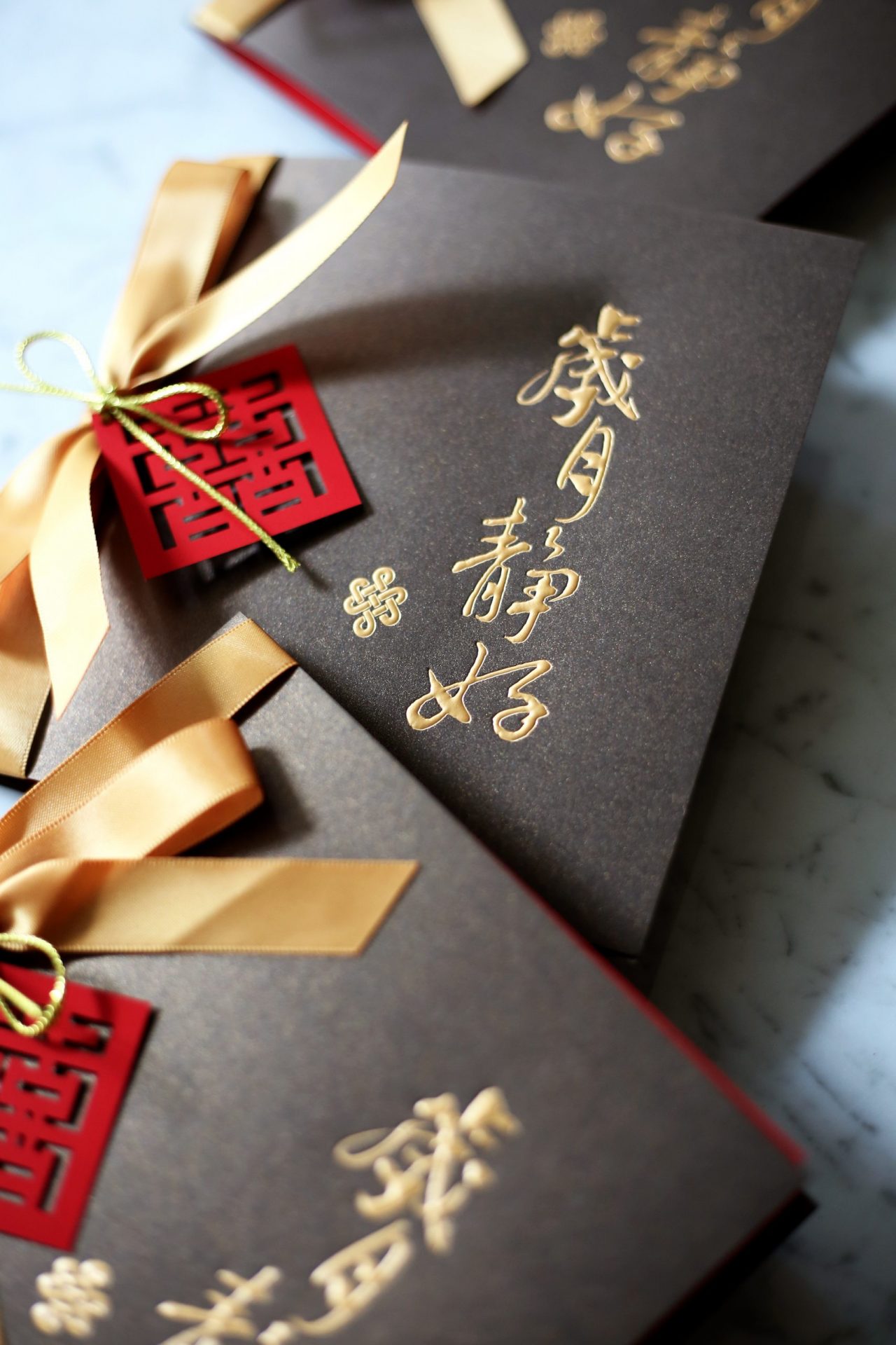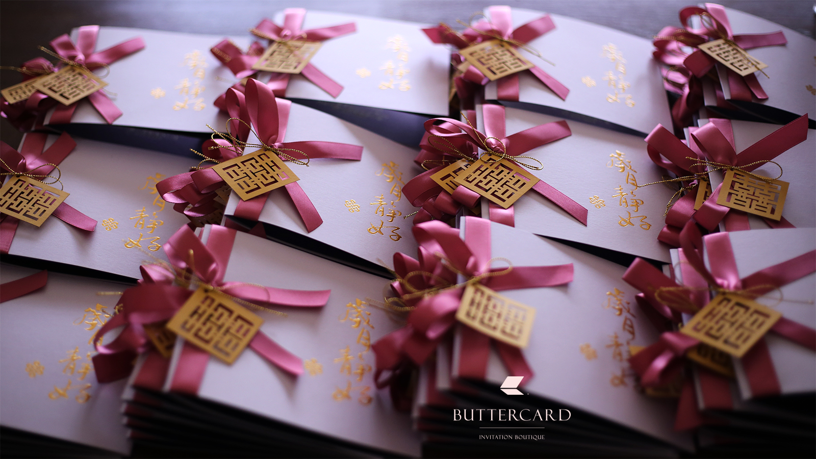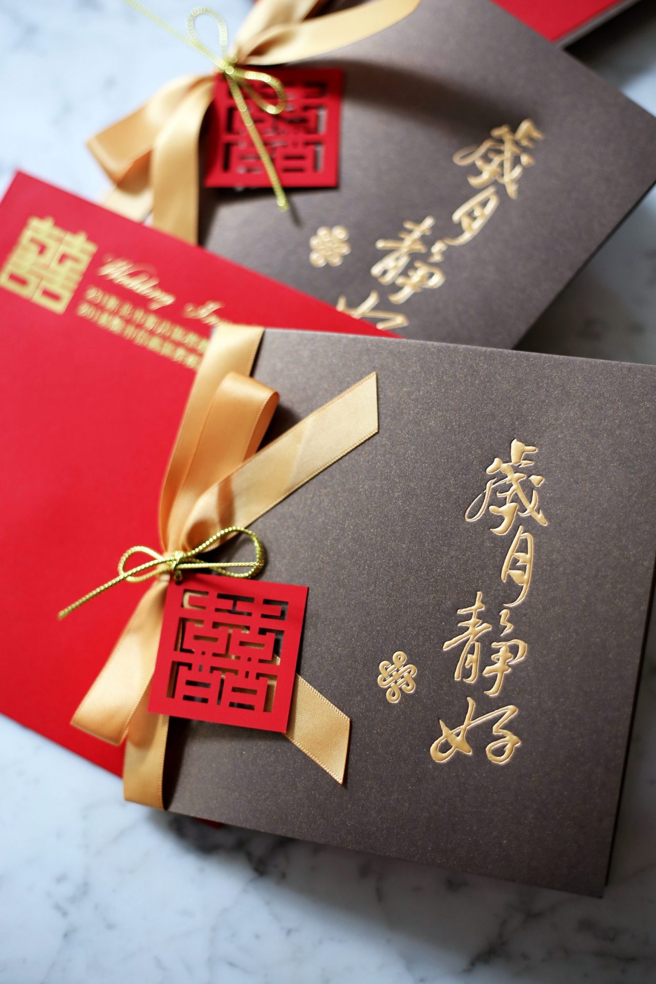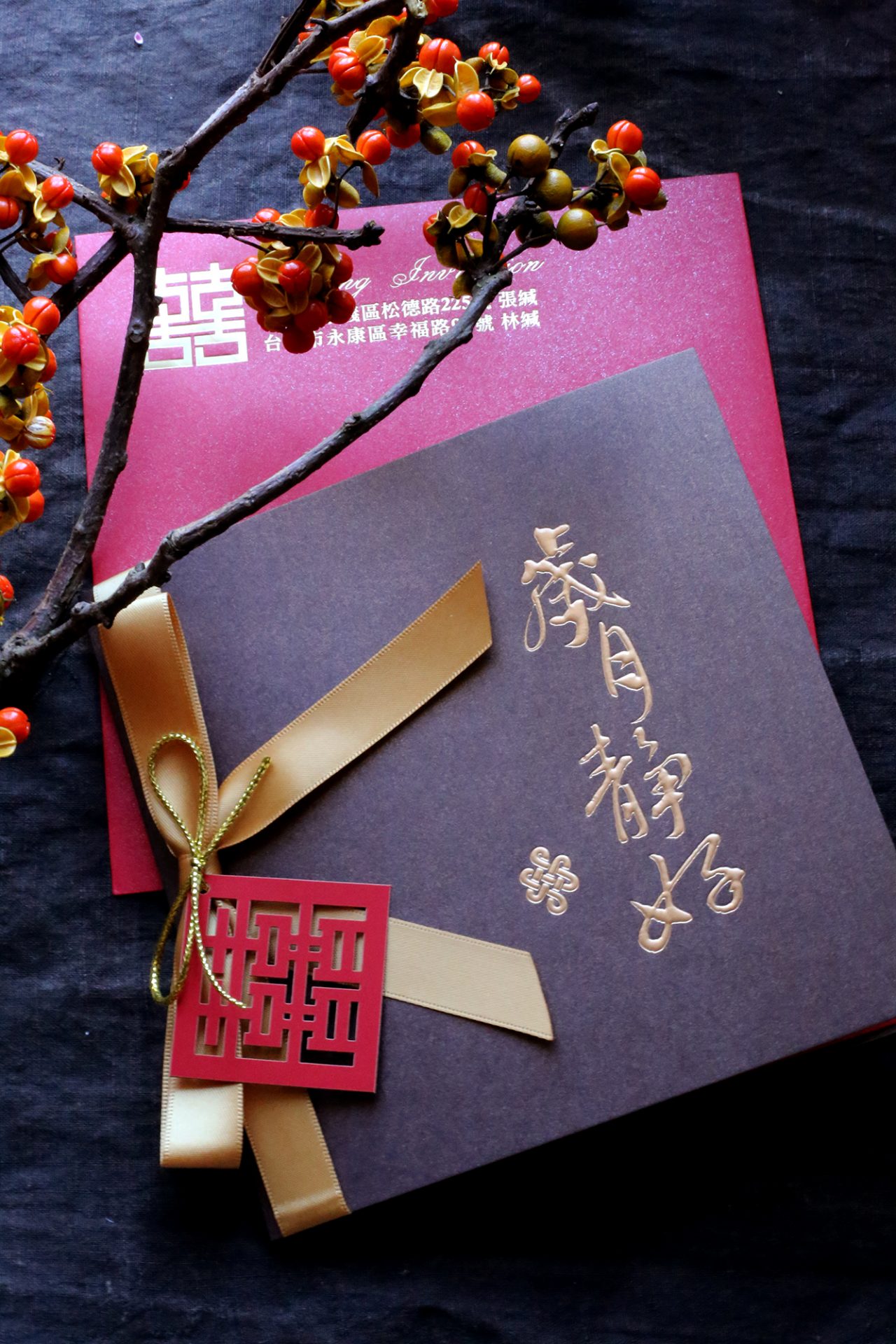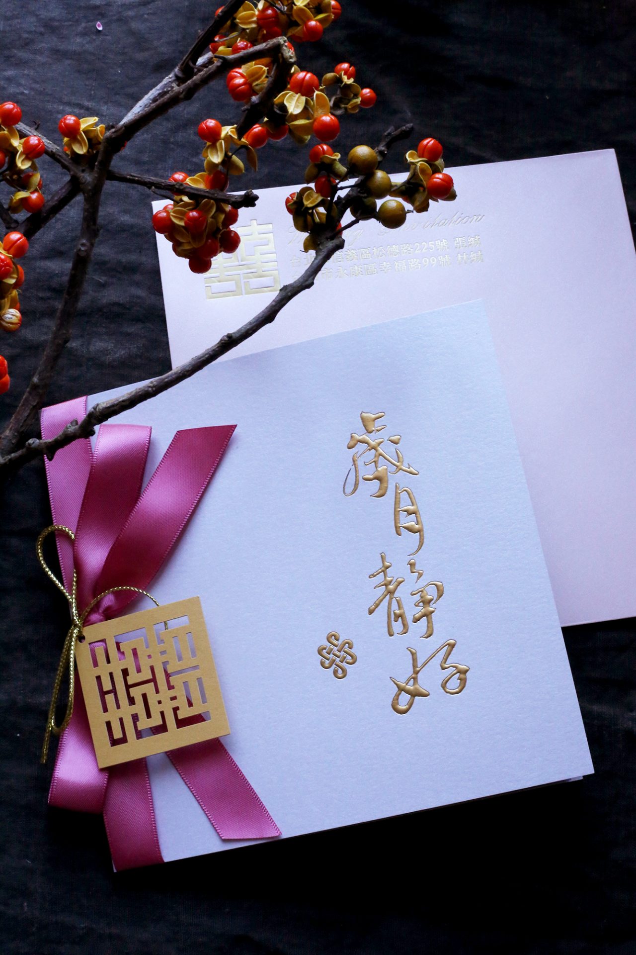 透過燙金和打凸二道程序處理「歲月靜好」的書法字體,並在外卡打上蝴蝶結並繫上 囍 字,