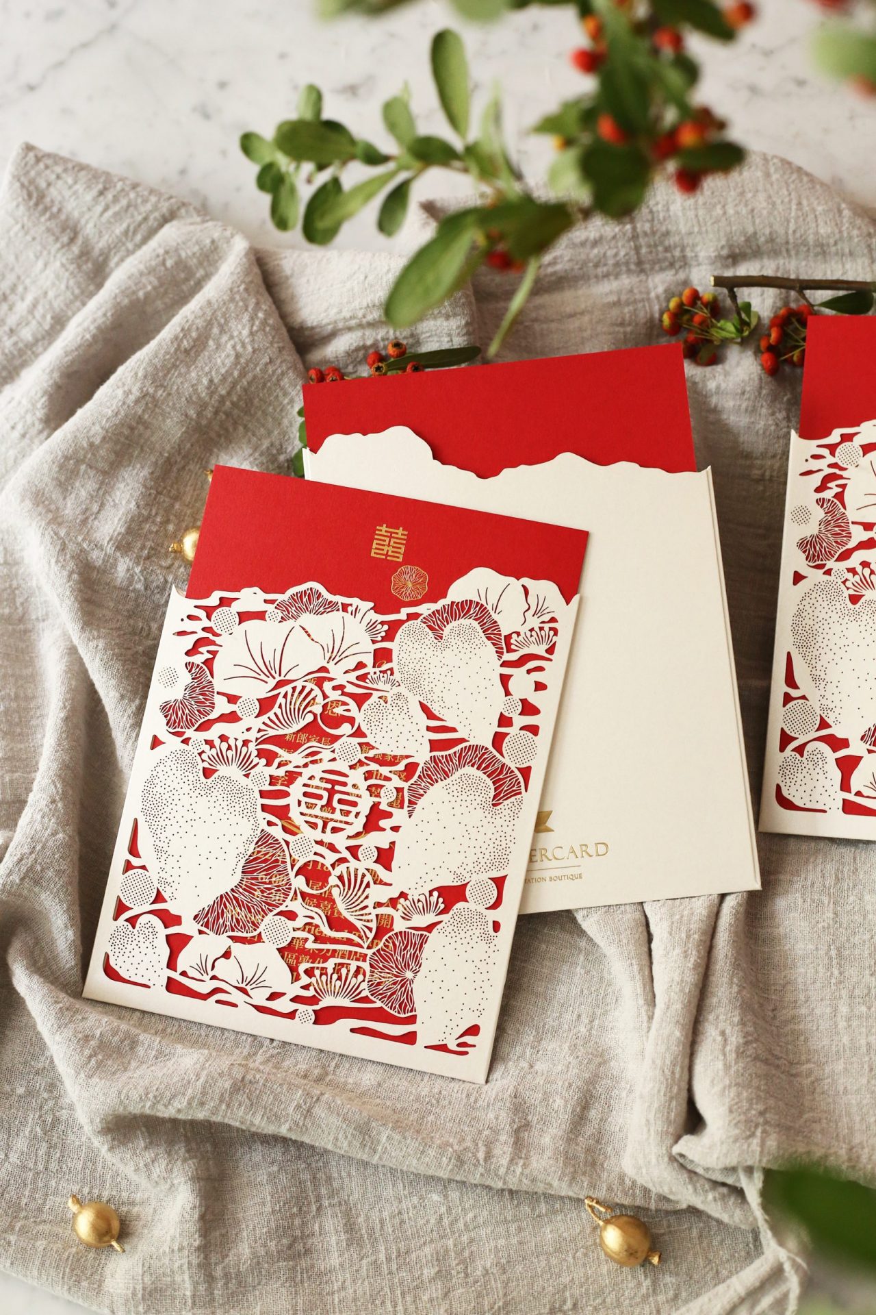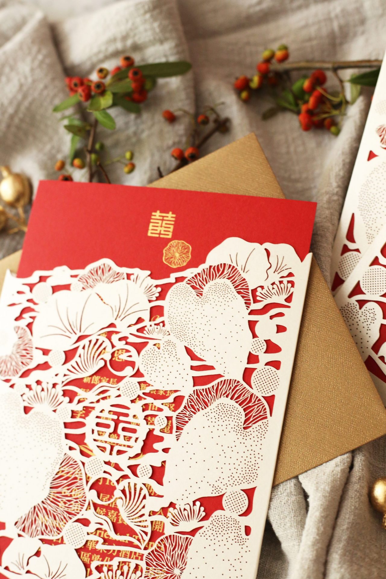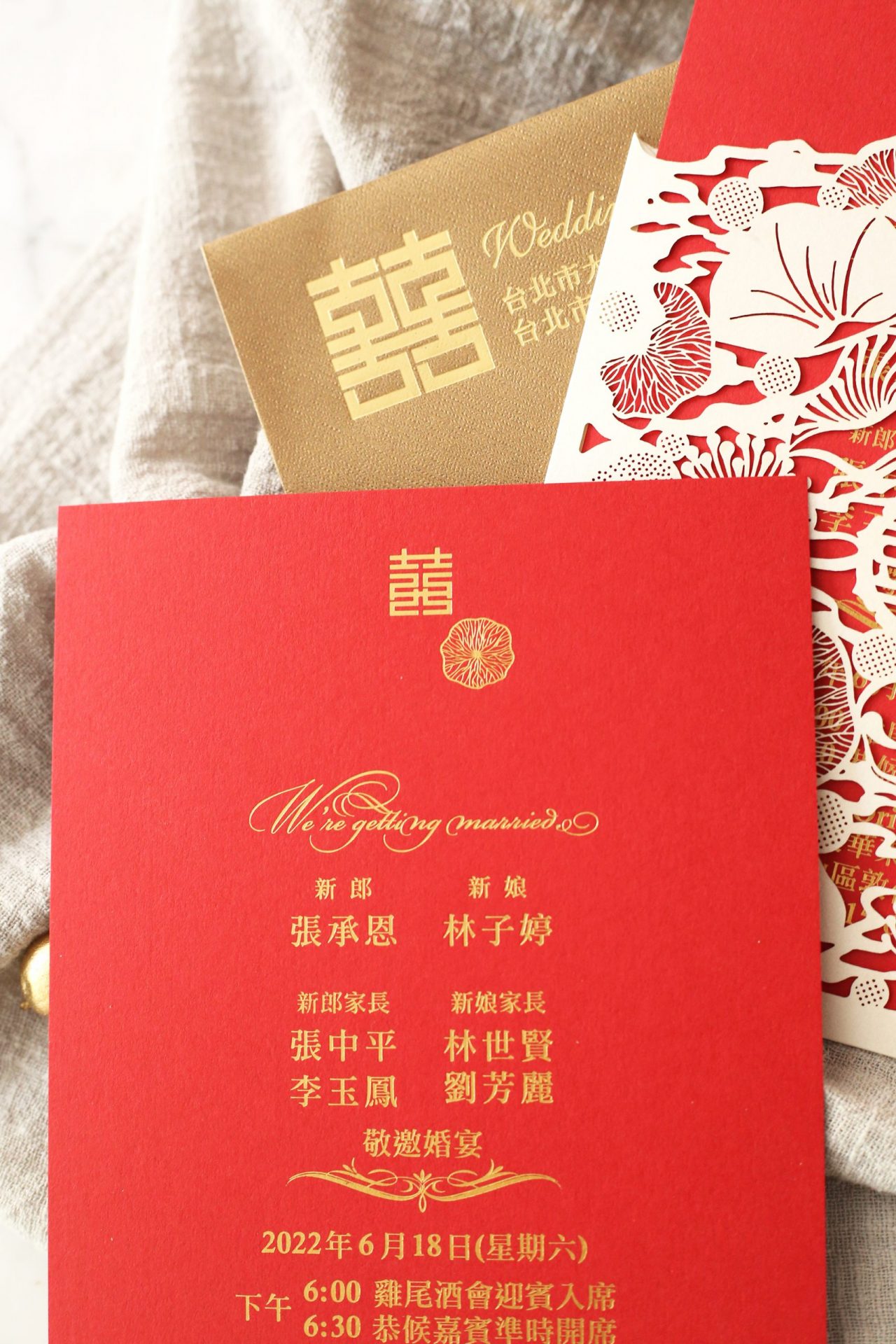 價格一樣包含婚宴資訊燙金、信封、信封燙金(寄件人地址)、信封封口貼紙。