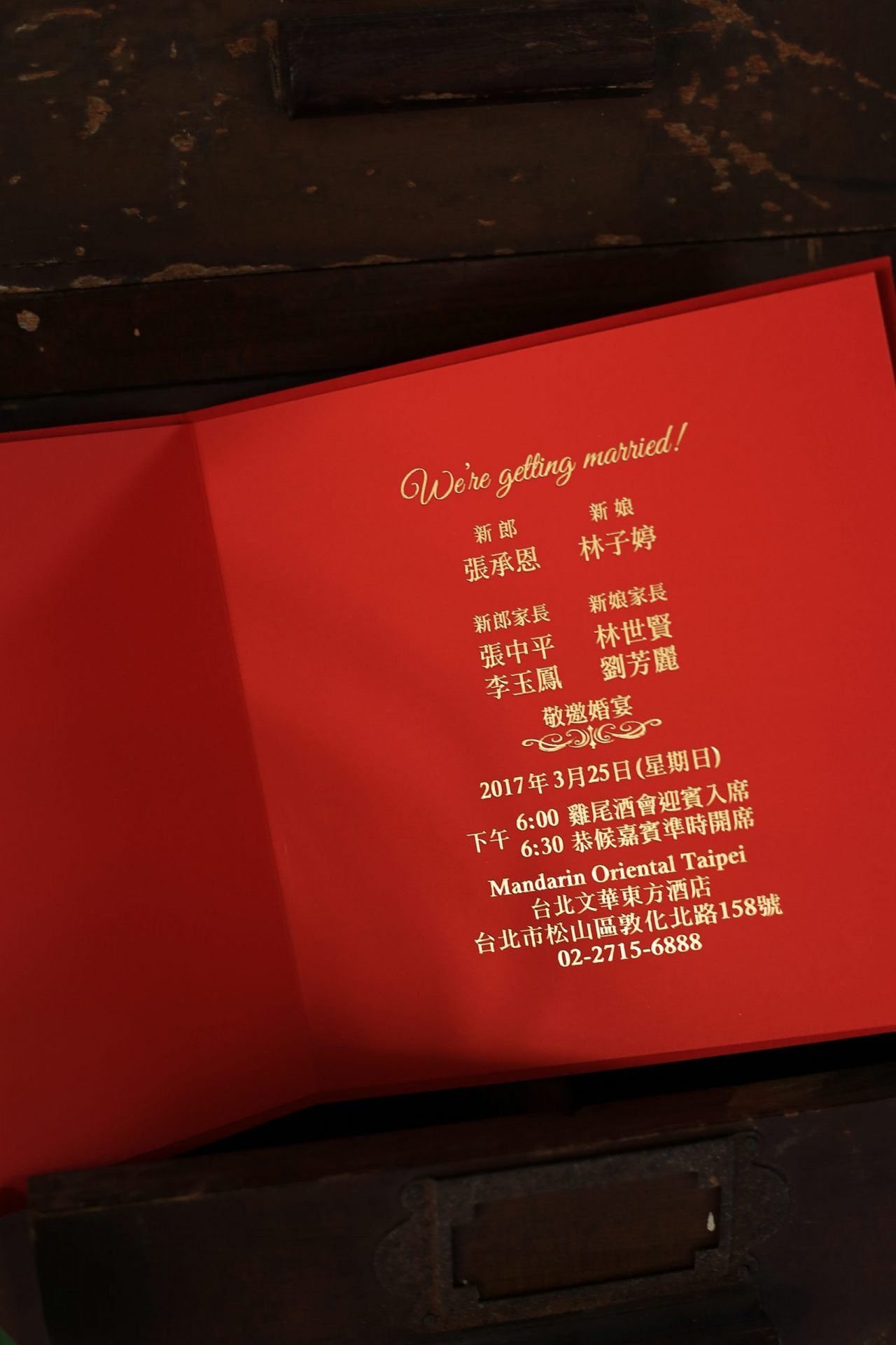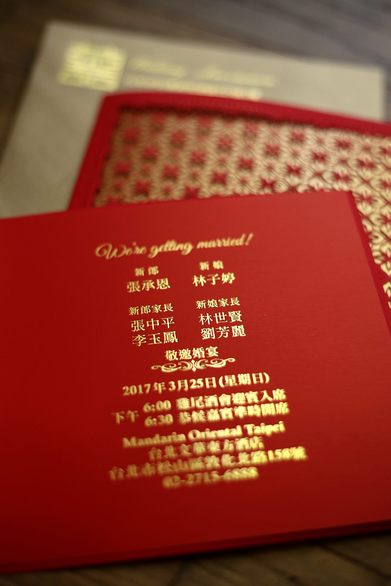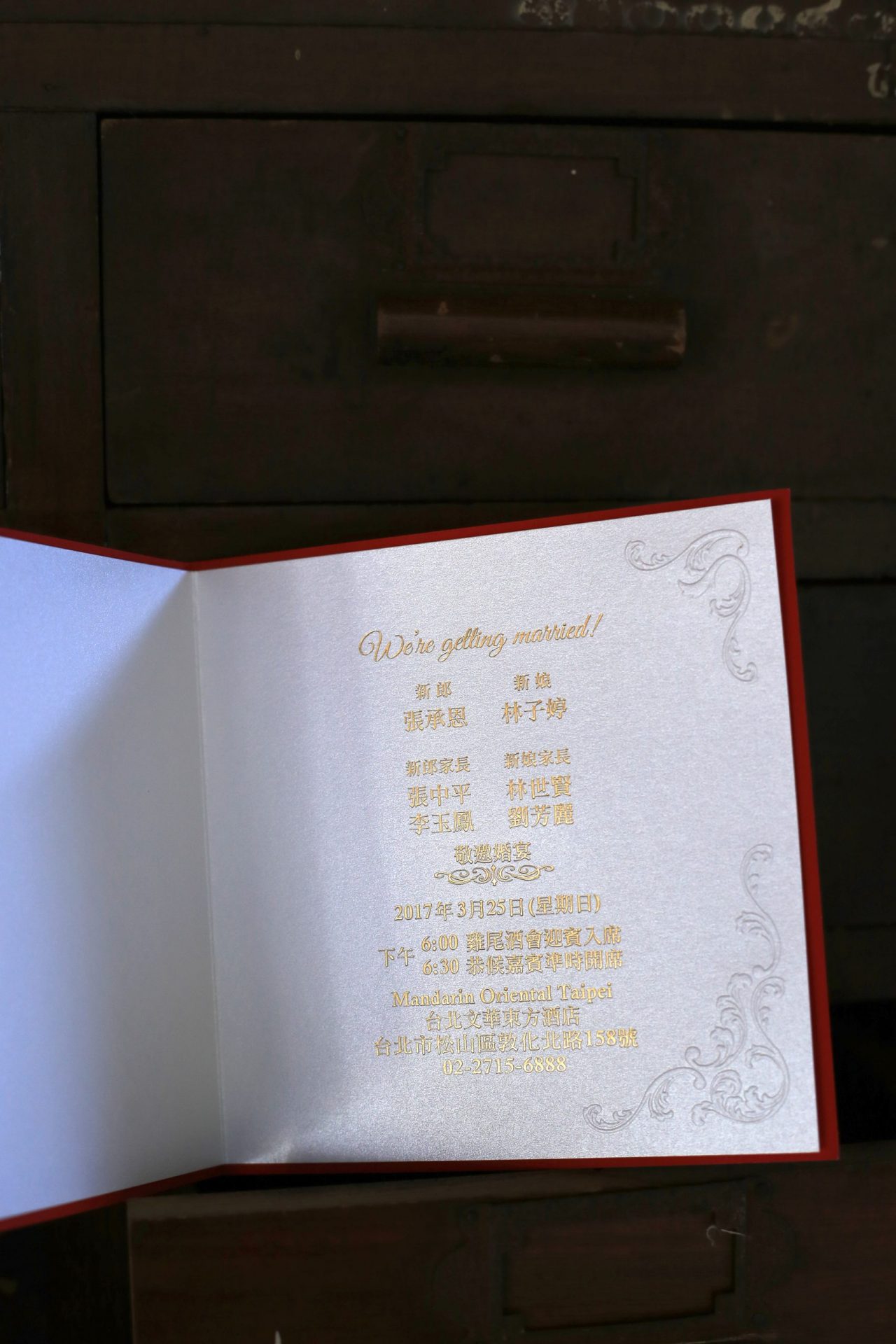 當我收到屬於我倆印製完成的喜帖時,感受到紙質質感相當的好,內文也是精美的燙金,有一種隆重的感覺,可以想見收到的賓客心中的感受也必定是相當喜悅。