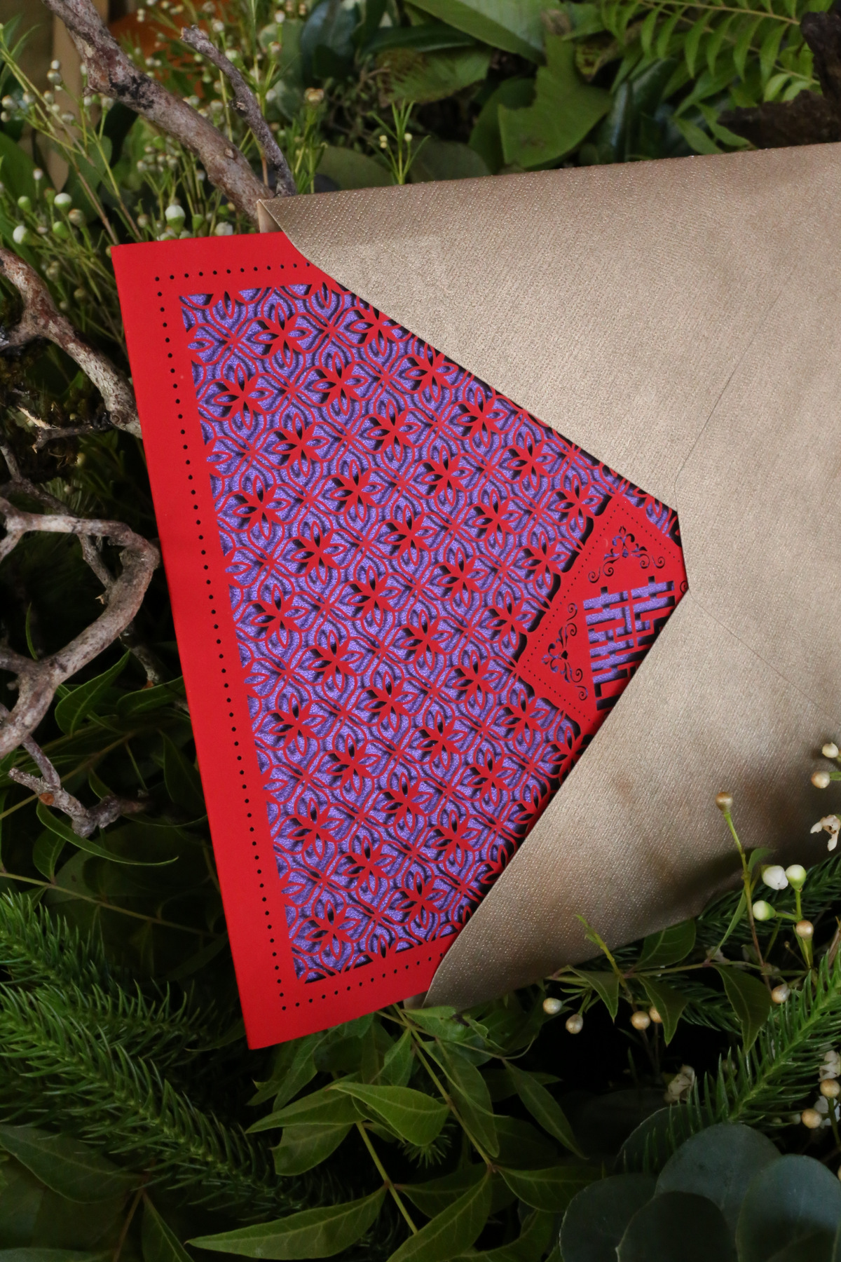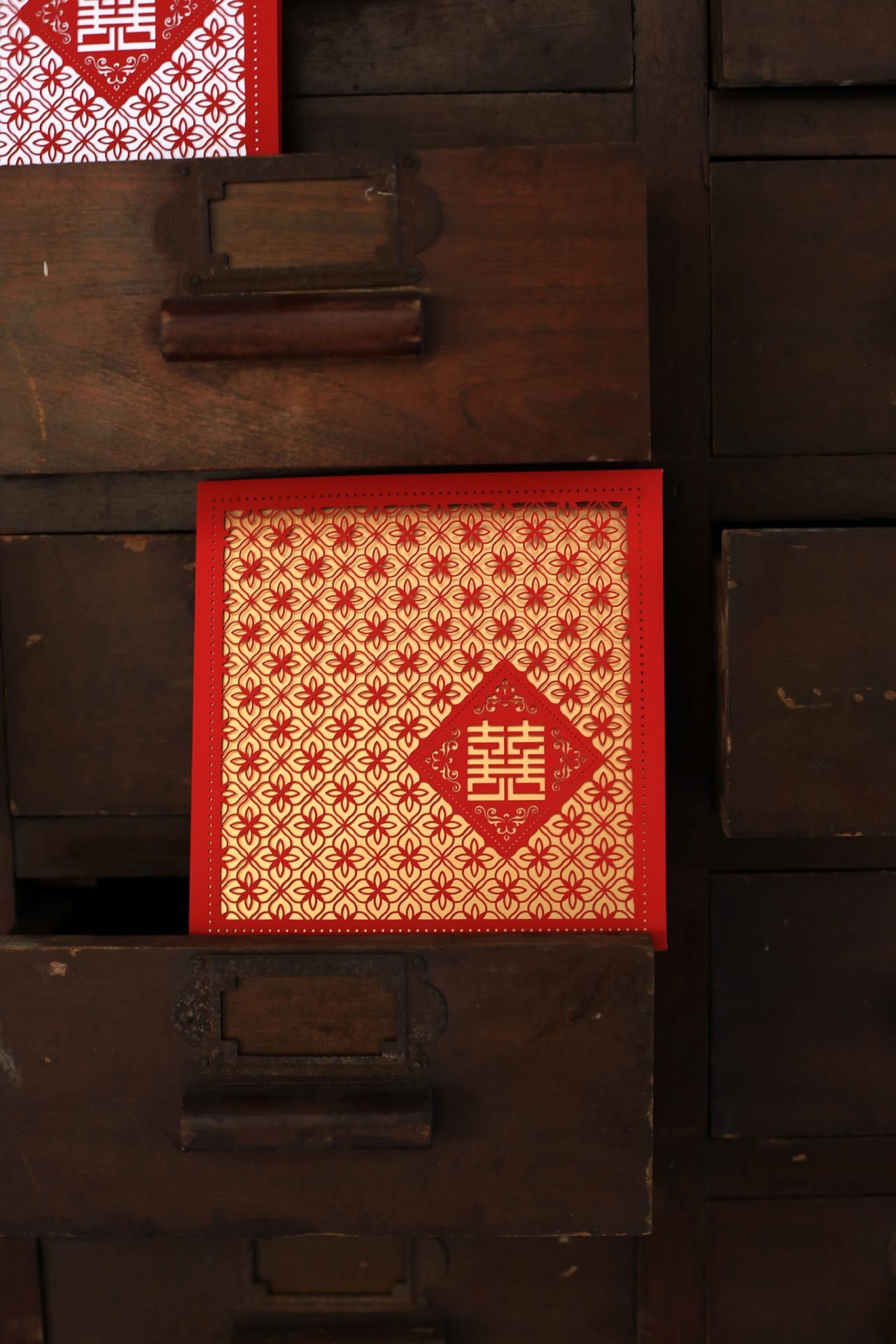 外卡以紅色絨面紙,將雷射紙雕做到極致,在紙張雕刻出細緻的窗花,