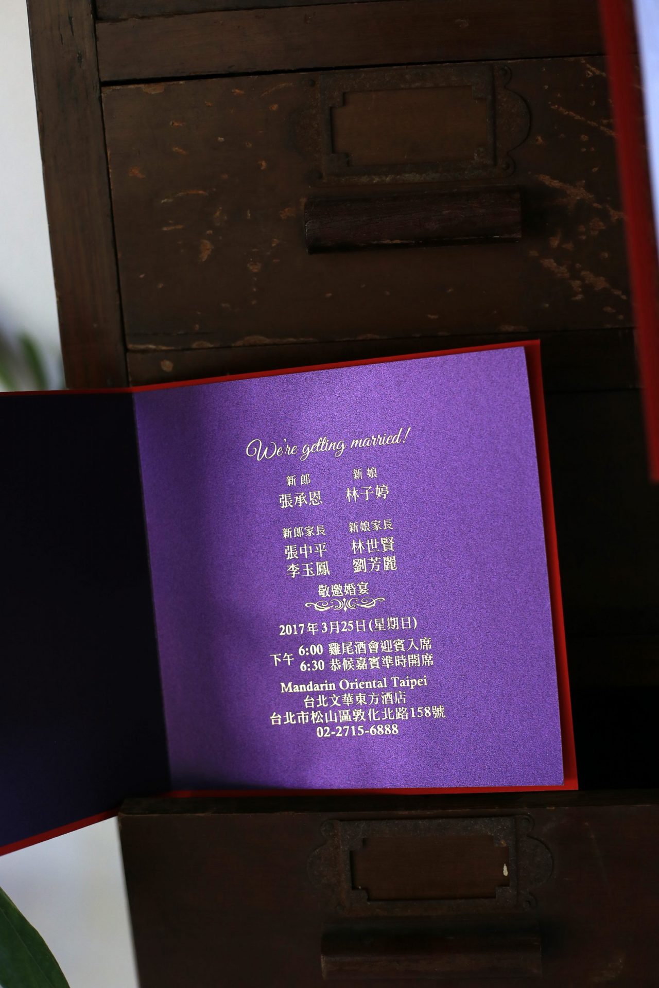 內卡有三種可選擇,光澤紫、珠光白和東方金,三款皆搭配古銅金信封。